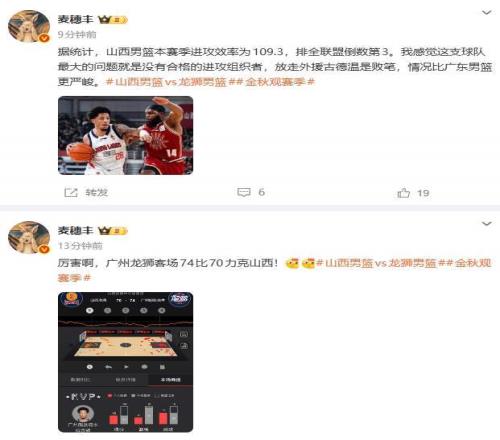 而广东媒体记者麦穗丰老师则惊呼:厉害啊,广州龙狮客场74比70力克山西!随后,麦穗丰老师又表示:据统计,山西男篮本赛季进攻效率为109.3,排全联盟倒数第3。我感觉这支球队最大的问题就是没有合格的进攻组织者,放走外援古德温是败笔,情况比广东男篮更严峻。