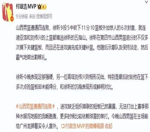 主场爆冷还输给广州队之后,篮球记者贾磊老师认为:山西在主场不敌广州,遭遇四连败。徐昕在防守端送出6次封盖。山西队今年确实遭遇了很大的困难,迪亚洛回归之后始终没有找到上赛季极具统治力的状态,而古德温的离开也让球队在后场上少了一个重要的进攻发起点。