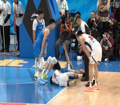 比赛第二节,周琦行进中被萨姆纳推倒,倒地过程中冲撞到徐杰的膝盖,随后担架进场。徐杰在队友的背负下离开比赛场地。