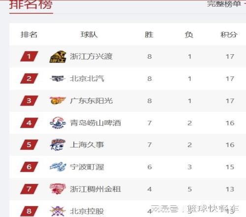 而北京队这一战掀翻广东队以后,他们的战绩变成了8胜1负,排在积分榜第2名。11冠王广东队,他们在输给北京队以后,8连胜纪录被终结,战绩变成8胜1负,排名从积分榜第一下滑到第三。排在积分榜第四名的是青岛队,他们在一度领先浙江队的情况下被对手逆转,最终加时遗憾输掉比赛。球队目前以7胜2负的战绩,排在积分榜第4名,而积分榜第五的是上海队,他们的战绩也是7胜2负。