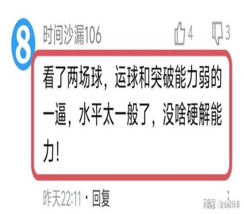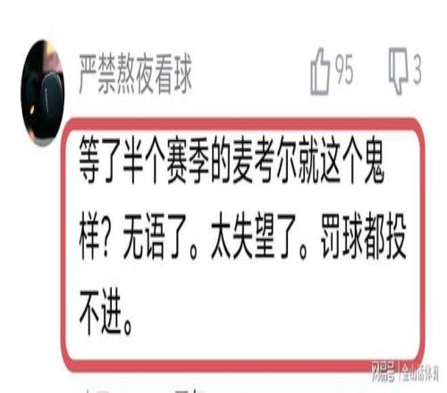麦考尔糟糕的表现,也让广东球迷大失所望,纷纷在网络平台吐槽。“等了半个赛季的麦考尔就这个鬼样?无语了。太失望了。罚球都投不进。”;“看了两场球,运球和突破能力弱的一逼,水平太一般了,没啥硬解能力!”;“打了两场了,啥水平看不出来吗?而且大伤了,不知道哪的自信?”;“不要怀疑朱杜选外援的眼光,从来没有选到一个能打球的。”……