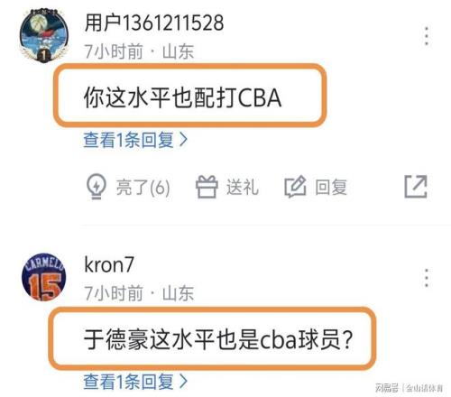 于德豪持续糟糕的表现,也遭到网友吐槽。“如果不是秋膘带着你 你的水平不配打cba”;“你这水平也配打CBA?”;“于德豪这水平也是cba球员?”;“北京首钢核心-于德豪”;“听说还是国家队队员”;“今天差点就要拿到北京户口了,奈何外援大哥不同意”;“这货有能力打CBA么,山东那么缺人么”;“差点最后输他身上”……
