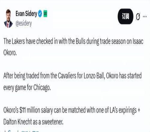 Sidery表示,奥科罗本赛季的薪资为1100万美元,下赛季是1181万美元。湖人可通过一份到期合同+克内克特的组合匹配薪资,完成这笔潜在交易。