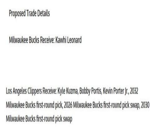 快船得到:库兹马+波蒂斯+小凯文波特+2032年雄鹿首轮+2026年雄鹿首轮互换+2030年首轮互换。