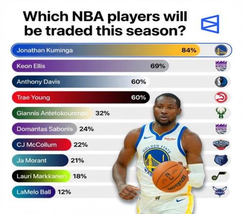 在美媒Polymarket统计的球员交易概率中,字母哥仅以32%排在第五名,远低于特雷杨(60%)、浓眉哥(60%)、埃利斯(69%)和库明加(84%)。