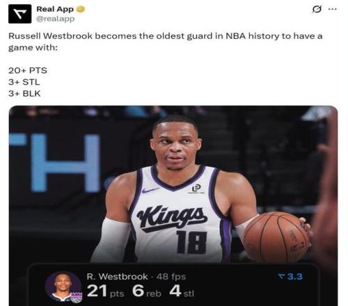 凭借这样的表现,37岁54天的威少成为NBA历史上单场拿到至少20分3断3帽最老的后卫。
