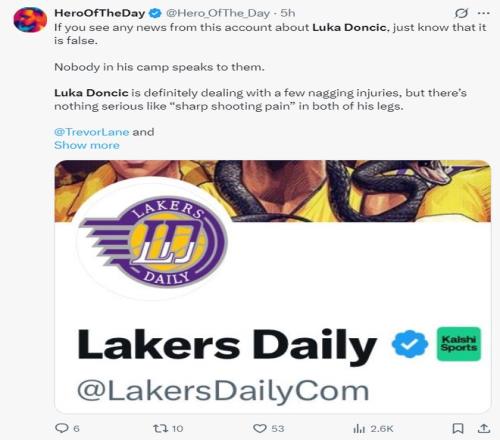 在这场比赛之前,著名的詹黑媒体HeroOfTheDay(下称HOTD)炮轰湖人媒体《Lakers Daily》,他表示:在这个账号上看不到任何关于东契奇的消息,他们阵营里不愿意承认很多真相,东契奇确实存在一些持续性的伤病,但他没有出现那种双腿抽搐的严重状态,他还是带伤出战。