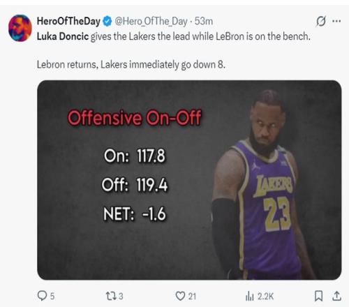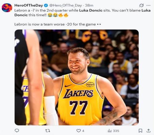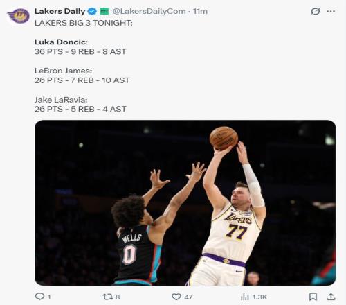 詹黑媒体HOTD不是说Lakers Daily从来不发东契奇相关的推文吗?赛后立马被打脸,东契奇36+9+8,詹姆斯26+10+7,拉拉维亚26+5+4,这不是关于东契奇的吗?