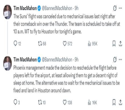 原计划在对阵雷霆后在晚上就飞往休斯顿的太阳队,因为飞机机械故障只能一早飞往火箭。
