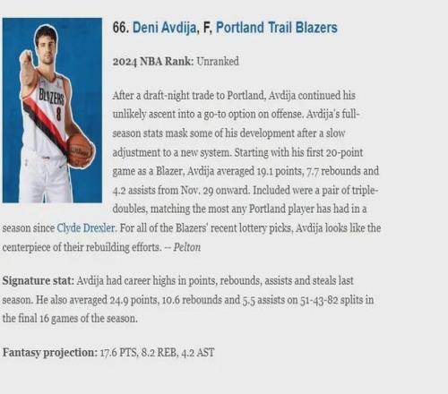 自打被交易至波特兰队后,阿夫迪亚的逆袭之路仍在继续,他逐渐成长为球队进攻端可以信赖的核心,在上赛季的整体数据表像之下,大家忽视了他在开拓者初期的适应战术体系的挣扎与后期的蜕变,自2024年11月29日他代表开拓者队砍下生涯首次20+得分后,其场均贡献19.1 分、7.7 篮板、4.2 助攻,期间还收获两次三双,这一成绩追平了自德雷克斯勒时代以来开拓者队球员单季最高三双纪录,在球队近些年选择的一众乐透秀里,阿夫迪亚俨然已成为波特兰队重建计划的核心支柱。