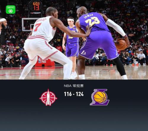 第四节,开节湖人里夫斯、拉拉维亚一波7-0反超4分,火箭申京、阿门得分追平,紧跟湖人詹姆斯连得4分,艾顿再中中投领先6分,随后湖人里夫斯、东契奇连续失误,火箭一波9-0反超比分,湖人詹姆斯站出来中投止血,紧跟詹姆斯反击遭遇犯规罚球追平,随后火箭阿门冲框再度领先,随后湖人八村垒、东契奇相继三分反超回来4分,火箭阿门得分止血,紧跟湖人东契奇连续助飞八村垒、詹姆斯空接暴扣,火箭连续失误,紧跟东契奇三分领先9分,比赛最后1分钟,火箭申京站出来连续得分,但湖人东契奇、里夫斯罚球稳稳命中锁定胜局,全场结束,湖人124-116火箭。