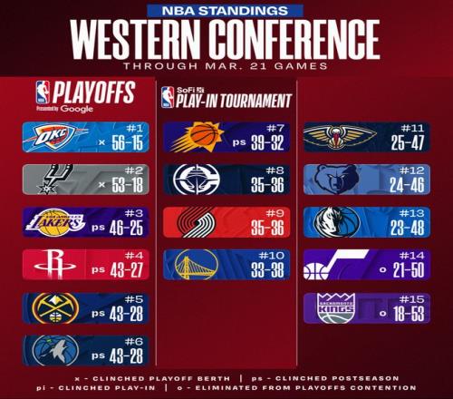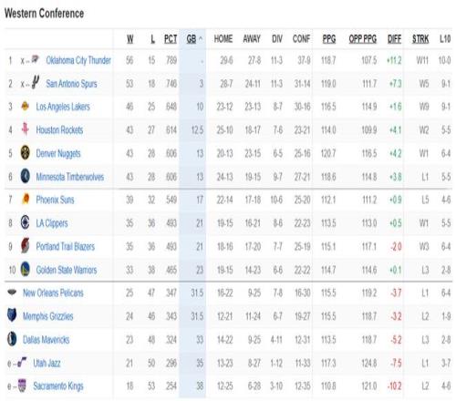 目前西部排名,1-6:雷霆、马刺(前二锁定季后赛)、湖人、火箭、掘金、森林狼;