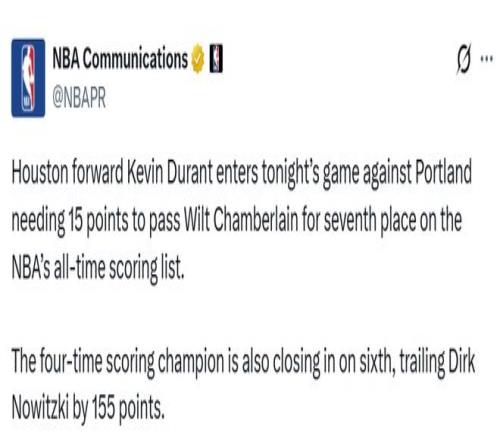 本周四,火箭队以102-103惜败开拓者,杜兰特砍下37分,生涯总得分来到31405分,再得15分就将超越张伯伦。张伯伦在1959至1973年的职业生涯中共斩获31419分,曾是联盟历史得分王,直至1984年被贾巴尔超越。不出意外的话,火箭今日在摩达中心再度对阵开拓者的比赛,杜兰特就将独享历史得分榜第七的位置。
