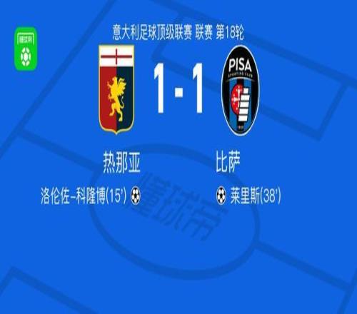 北京时间1月3日,意大利足球顶级联赛第18轮,热那亚主场迎战比萨。比赛中,洛伦佐-科隆博为热那亚率先破门,取得领先。随后,莱里斯为比萨攻入一球,扳平比分。最终双方以1比1握手言和。