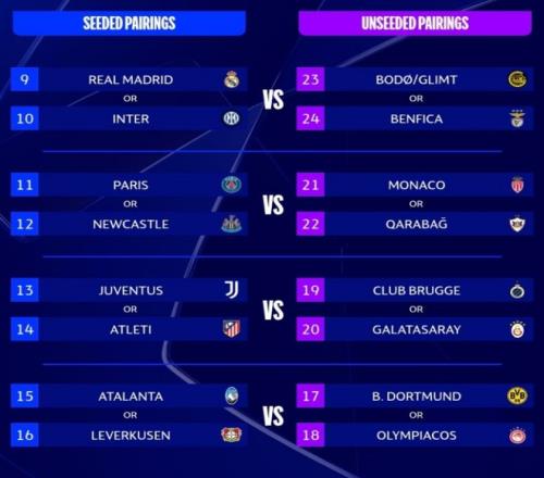 此外,国米/皇马VS博德闪耀/本菲卡的附加赛两支胜者,将再次与葡萄牙体育和曼城进行16强对阵抽签。
