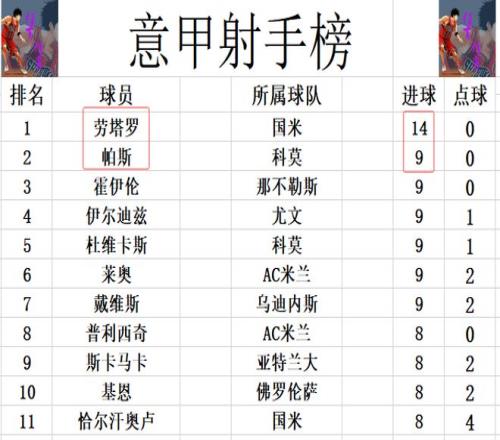 射手榜方面,还是劳塔罗14球领跑,帕斯,莱奥,伊尔迪兹,杜维卡斯,霍伊伦等人9球并列第2。普利西奇今天没有进球,还是和斯卡马卡,基恩,恰尔汗奥卢等人8球刚好挤入前十。