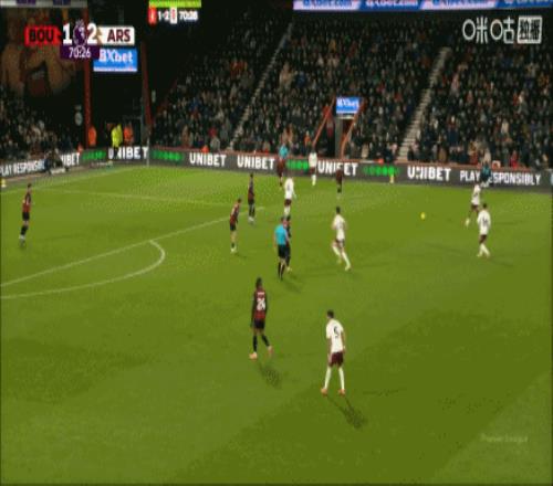 不过,第54分钟,阿森纳还是在对方多人密集防守的情况下,完成了打破1-1的进球。整体来看,伯恩茅斯的全部11人都在自己的半场回防,而最终在赖斯完成射门时,伯恩茅斯在禁区有多达8名队员,由此可见他们防守是有多么的密集。可哪怕是这样,阿森纳还是通过一次高空传递之后的禁区造险,由后插上的赖斯完成了推射。
