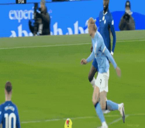 第38分钟,哈兰德禁区内轻巧晃过巴迪亚希勒,之后的兜射击中立柱弹出。