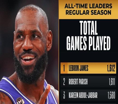 詹姆斯常规赛出场数达1612场,超越帕里什独享NBA历史第一